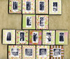 A few years ago, I collected wedding pictures of all of the parents, grandparents & siblings in our family. For unmarried adults I took college/high school graduation shots, and for children I used christening images. I wanted them all to be of a formal variety, and timeless. I converted everything to black & white, and now I use them in various crafty ways, including the family tree magnets pictured here, another set of family tree magnets I made for my brother-in-law and new sister-in-law when they got married, and a wedding bracelet that I wore to my cousin’s wedding. I also took some less formal current photos and used them in another set of magnets I gave the boys to play with a few years ago. It was a great idea at the time because it helped them learn the faces and names of relatives we didn’t see on a regular basis.