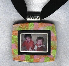 I love having all of these old photos available digitally, and the ability to transfer them to a hard, durable medium like polymer clay is a great bonus. They make great pendants, pins, tile bracelets, and I’d imagine you could even put your grandmother’s face on a button and sew it to your baby’s handmade sweater! (Wish I’d thought of that when I had babies around…) Keychains are good too. I’ve got a double-sided key chain with Son #1 on one side and Son #2 on the other. As you can see, the possibilities are endless, and it’s a lot of fun to carry your photos around with you in an unusual and artistic way.