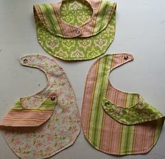 Today I did a little fabric shopping so that I could try again to make a better version of that shirt I didn’t like. I came home with another design in the Freshcut line, and while I haven’t used it yet to make the new shirt, I did manage to whip out three reversible bibs. Don’t they just make you wish you had a sweet little neck to stick them around?! I love ’em. I got the instructions out of Amy Karol‘s Bend the Rules Sewing. The top one was the first one I made and it has some issues, both with the stitching and with the snap, so that’s my “practice bib.” The other two are going to a friend of mine who just had a baby. They are so easy to make, and I just want to crank out a pile of them! I wish I’d known how to do this 7 or 4 years ago when I needed a pile of bibs.