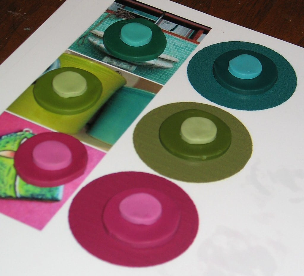 The samples on the right are the original recipes, and those on the left are new. I added some Granny Smith to the blue recipe, some Yellow to the green recipe, and some Red to the pink recipe. I think I am happy with the lighter versions of these colors and am ready to move on to the next step. Notice that the darker versions of the new colors don’t really match the big dots. That’s ok. They don’t have to, as long as their lighter counterparts are acceptable.