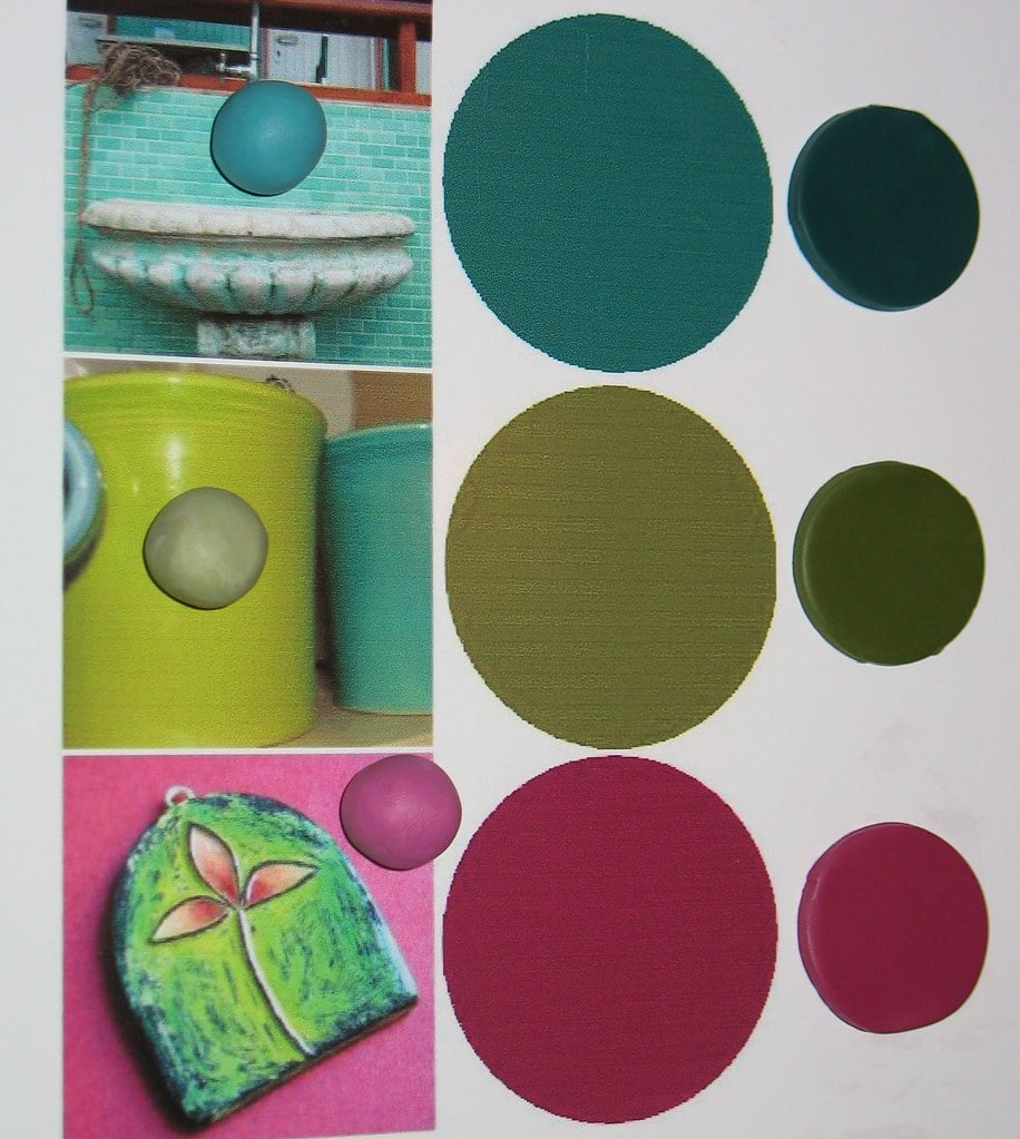 For the most part, my instincts were right on, although I had some trouble with the pink. I ended up also adding a bit of red and white. I was happy with the way the dark colors on the right mixed up, so I added some white to them to see how they compare with the original images. Remember, what I really want out of this color scheme is for those lighter colors to speak to me. No matter how accurately I match the dark clay to the dark dots on the paper, if the lightened versions don’t look enough like the photographs, I’ll need to adjust the recipes.