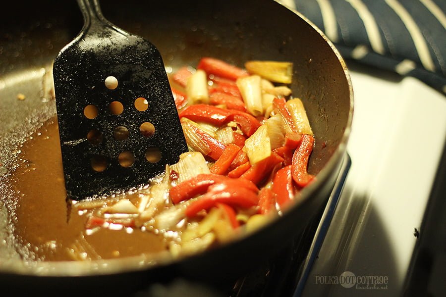 - Put the leek and pepper in a large skillet with a little bit of olive oil. Saute for about 3 minutes, just until the vegetables begin to wilt. Remove vegetables from the skillet and set aside. Add chicken to the skillet (and more olive oil, if necessary), and cook in the vegetable juices until no longer pink. Add the sauce to the skillet. Bring to a boil, and simmer on low heat for about 5 minutes. Prick the chicken with a fork, to let the juices seep in. Add the vegetables back into the skillet and cook for an additional 5 minutes, or until the chicken is cooked through.
