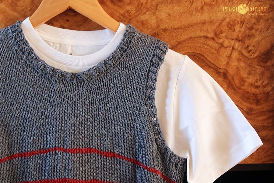 - A mostly-blue, with stripes that fade to red at the bottom, size 9-10 years. I improvised the stripe design and improved upon my mistakes from the first vest. I’m really happy with this one.