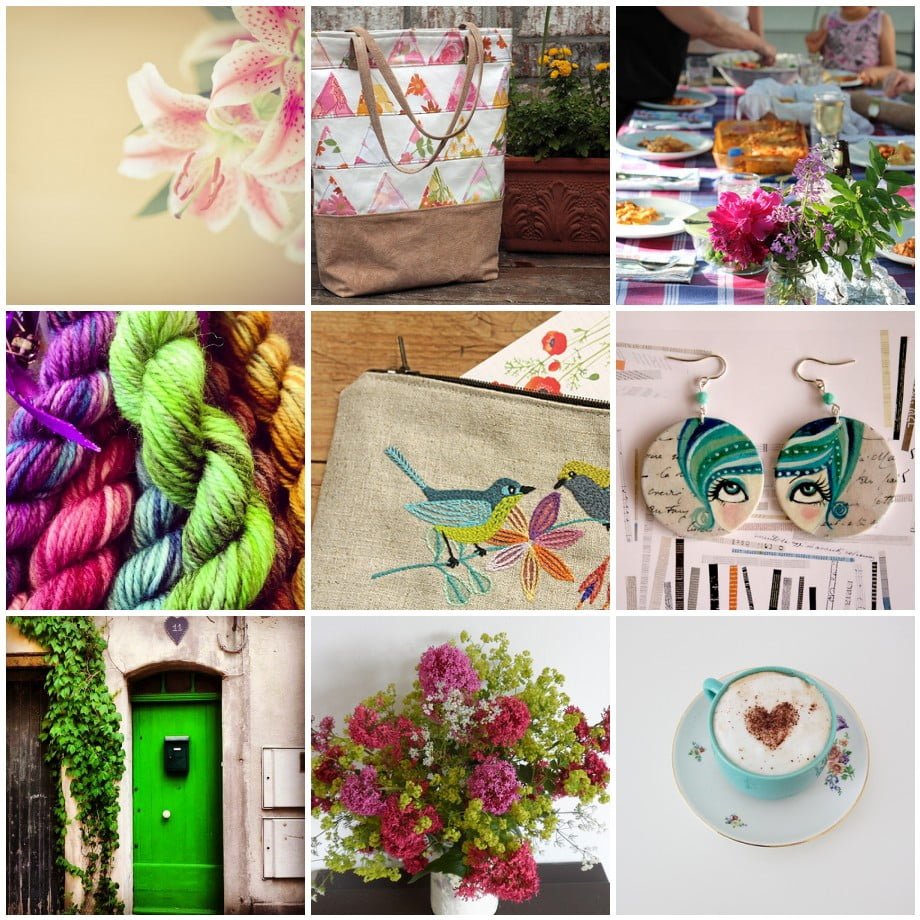 1. lilies, 2. triangle tote, 3. dinner the other night, 4. Some mini-skeins dyed up by @daisyhays! Beautiful. Looking forward to Making some hexipuffs. Rain chime fiber arts on Etsy., 5. Birds embroidery, 6. Untitled, 7. green door, 8. Garden Flowers, 9. Untitled
