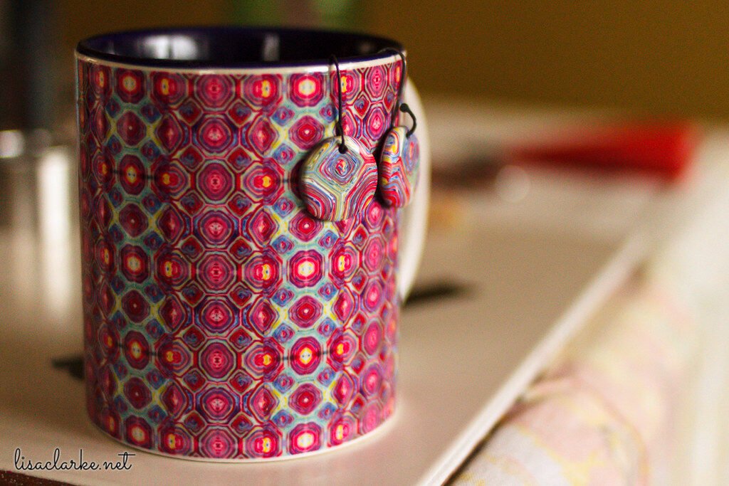 365: 2016 70/366 – I had another mug made based on one of my polymer clay patterns (Rainbow Tortoise) and it arrived today. I love it! But what was really fun is that I happened to be wearing earrings I’d made in that same pattern. Look how well they go together!