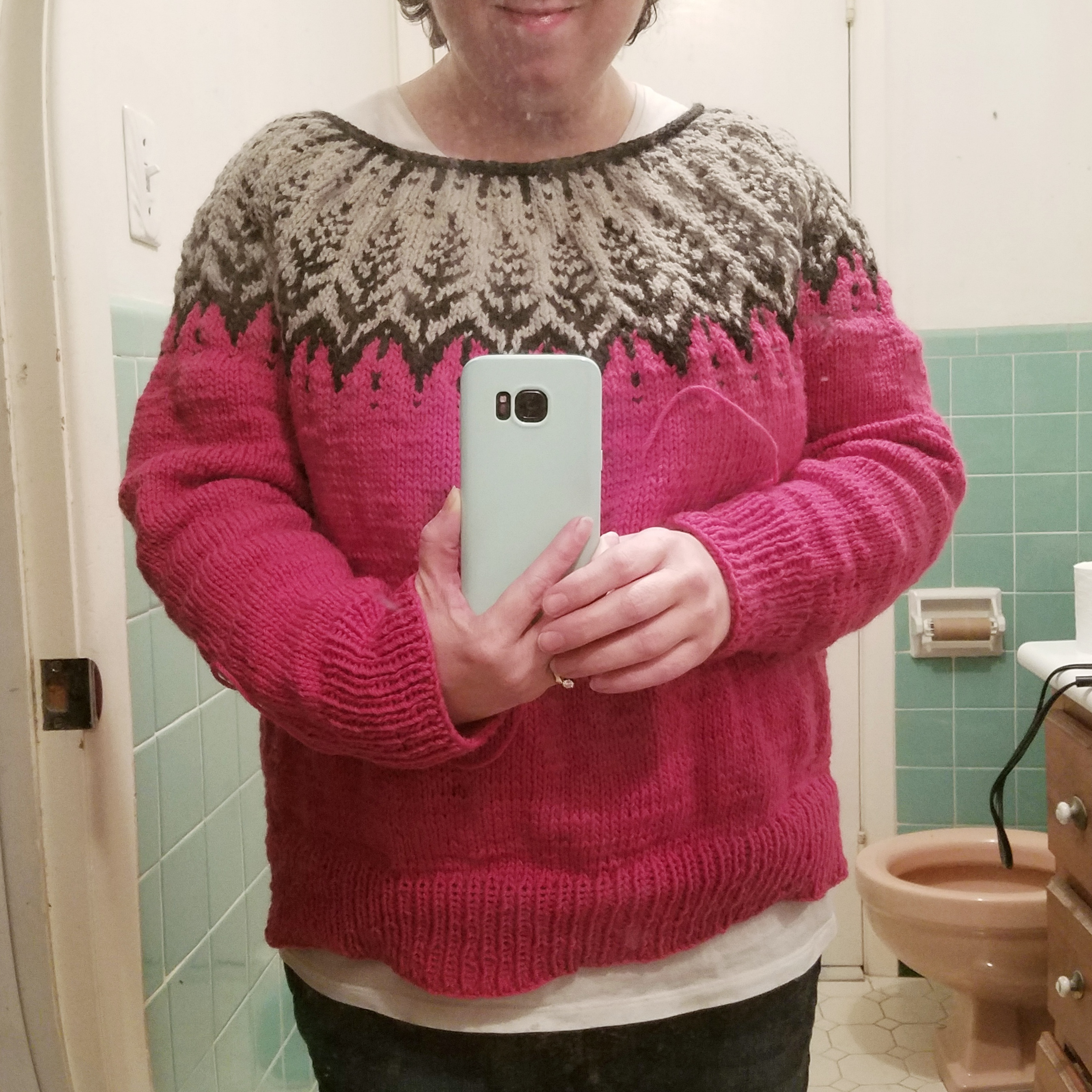 Was just looking at your first post when the second one came in. I have admired that pattern for awhile. I considered joining in on Berroco’s Lopi KAL but in the end decided it would cost a fair amount and more importantly, I probably wouldn’t finish in time to wear this year as my region of Georgia has mild winters and I am often running the AC in March. I looked at the pics others posted of this sweater in Ravelry and I think your choice of colors is probably my favorite. I think your finished sweater is beautiful and looks good on you. Great job!