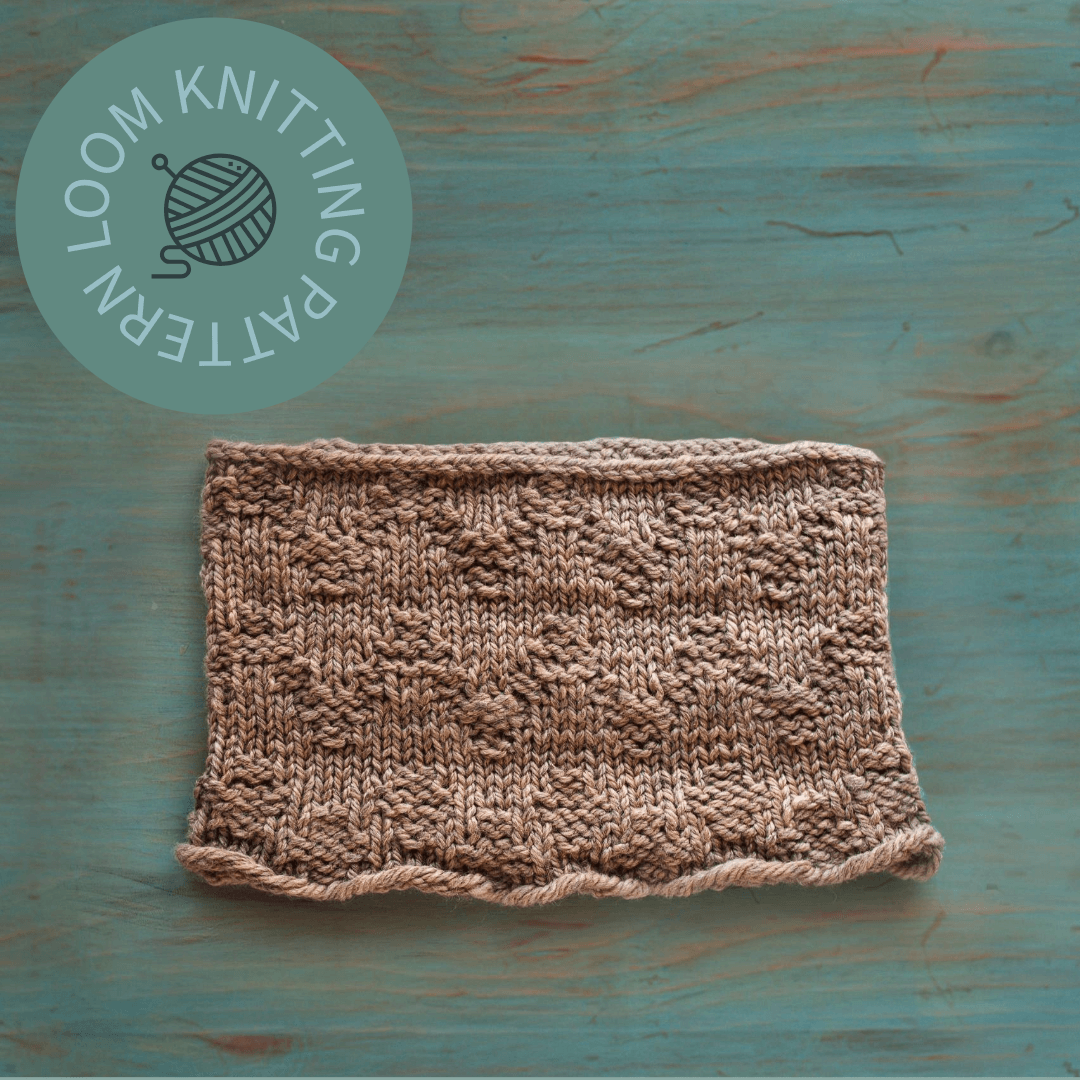 This cowl, with its bulky yarn, knits up quickly in just one or two evenings, and it only requires the most basic of knitting loom stitches: knit and purl. The zig-zaggy chevron texture is achieved through judiciously-placed purl stitches among the knit stitches.