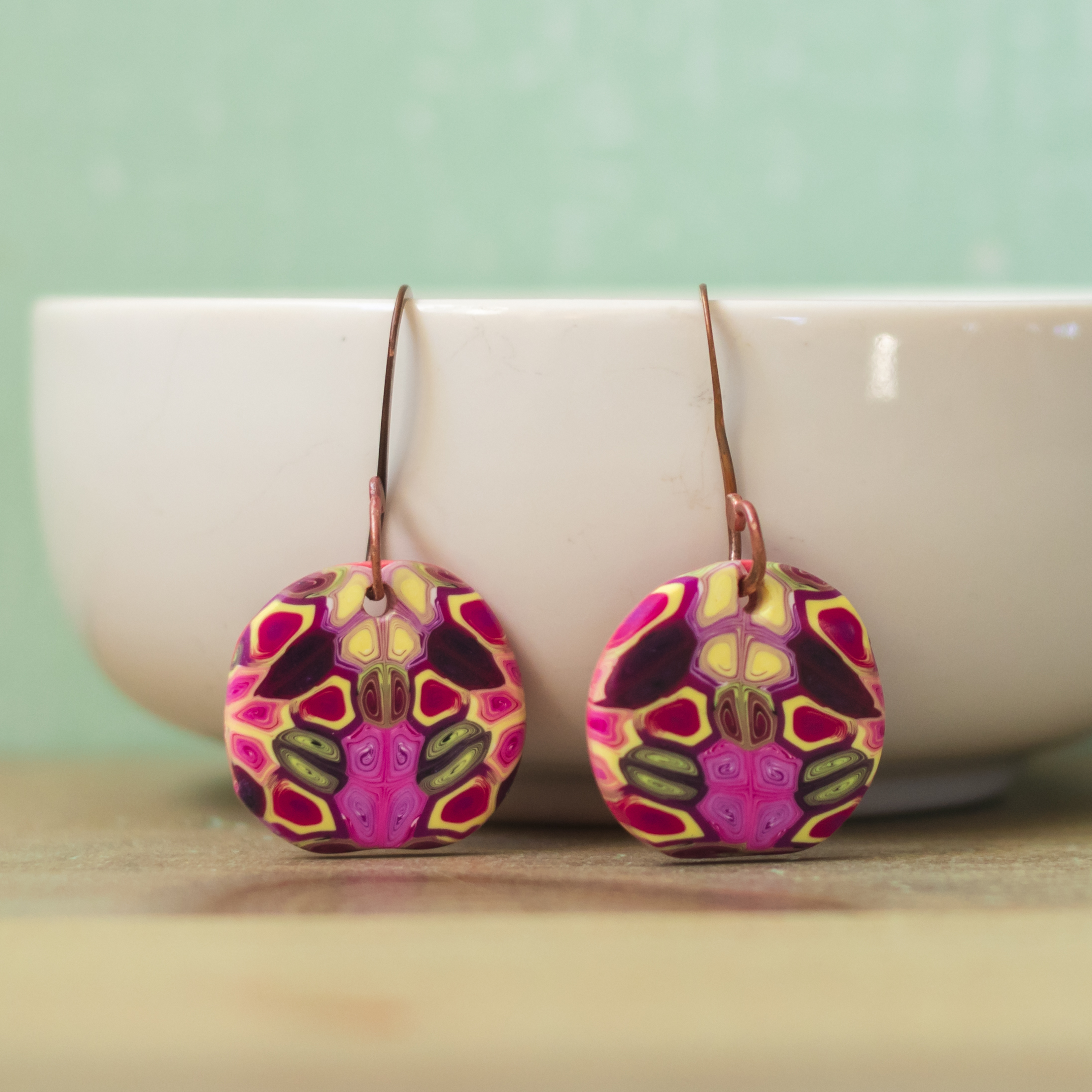 These colorful handmade earrings consist of dangly beveled-edge polymer clay tiles. The tiles feature a veneer of one of my signature millefiori designs. The tiles come in a variety of shapes and hang from unique copper, silver or brass ear wires.